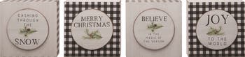 Enhance your holiday decor with the Transpac MDF Dimensional Plaid Block Set of 4 Christmas Home Decorations This charming set features four freestanding signs that add a festive touch to your tabletop Each block measures 4.75 inches in height and length with a width of 1.75 inches showcasing a delightful multicolor plaid design Made from durable wood material these decorations are perfect for the Christmas season and can be easily cleaned with a simple spot or wipe care routine Bring joy and warmth to your home this holiday season with this beautiful plaid block set