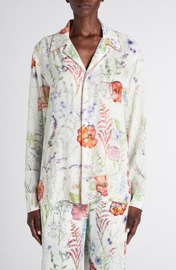 Creative Director Seán McGirr blends McQueen's macabre heritage with a sense of lightness and playfulness in this classically piped pajama shirt, where hasty etchings of wildflowers and watercolor pops mingle with the requisite cobwebs.