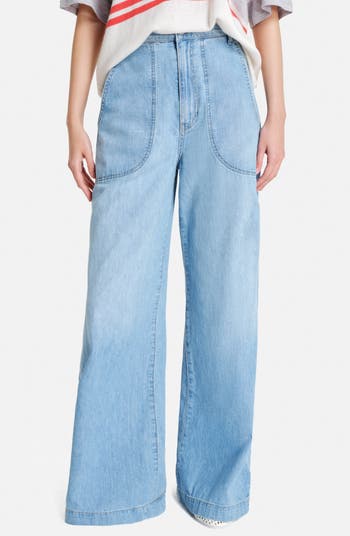 Leg-elongating wide hems punctuate these high-waist jeans made in a faded vintage-inspired wash.