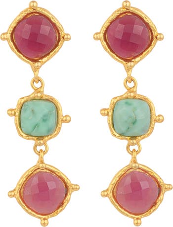 Gold plated brass clip earring "Medicis" -Vibrant and elegant, these gold-toned drop earrings feature a striking trio of gemstones—deep pink and mint green—set in textured frames. A colorful statement piece perfect for any occasion.
