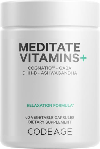 Codeage Meditate Vitamins+ combines advanced ingredients, including CognatiQ™, a patented ingredient linked to brain health, DHH-B, GABA, ashwagandha, organic mushrooms, and blueberries in a convenient capsule format.