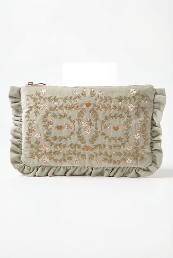 Inspired by the ornate beauty of Mediterranean gardens, this design features intricate embroidery and shimmering gold threads. From daytime to dinner plans, it transitions instantly from organiser to frilled evening clutch.