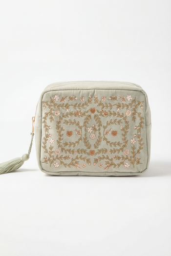Inspired by the ornate beauty of Mediterranean gardens, this design features intricate embroidery and shimmering gold threads. Be travel-ready at all times with a zip tassel, inner pockets for full-sized skincare and beauty and waterproof lining - no more suitcase spills.
