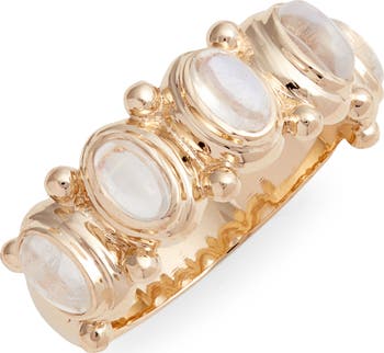 Milky moonstone cabachons make a subtly showy statement on this hand-polished and handcrafted ring.