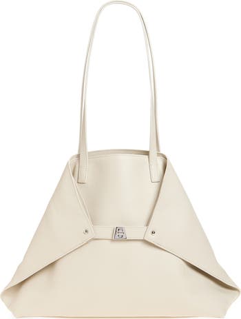 A minty hue refreshes the look of this signature calfskin-leather tote that quickly converts to offer a chic assortment of varying looks. Carry it as a classic shopper or cinch it using the inventive turnlock tabs to create a streamlined trapezoidal silhouette, a hallmark of the Akris fashion house. Elongated handles offer additional versatility, allowing you to seamlessly switch from handheld to over-the-shoulder styling.