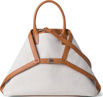 A contrast calfskin base and trim refresh the look of this signature cotton-linen tote that quickly converts to offer a chic assortment of varying looks. Carry it as a classic shopper, or cinch it using the inventive turnlock tabs to create a streamlined trapezoidal silhouette, a hallmark of the Akris fashion house. Elongated handles offer additional versatility, allowing you to seamlessly switch from handheld to over-the-shoulder styling.