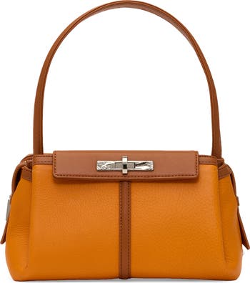 A polished turnlock clasp and structured baguette silhouette add to the timeless appeal of this top-handle bag that offers dual interior compartments to keep belongings organized.