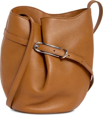 Sculptural and softly structured, this bucket cinches with a slender, diagonal belt that creates graceful curves, making an artful finish for every look.