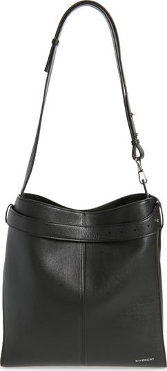 An integrated adjustable belt details the top of this compact tote designed in a lightly structured silhouette from richly grained calfskin leather.