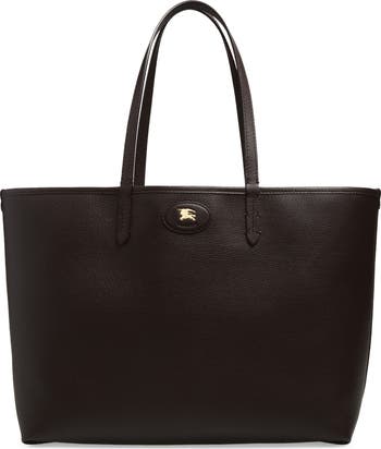 A house-signature Equestrian Knight gallops across the front of this reversible tote that switches from classic pebbled leather to cotton-blend canvas patterned with instantly recognizable checks.