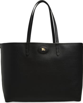 A house-signature Equestrian Knight gallops across the front of this reversible tote that switches from classic pebbled leather to cotton-blend canvas patterned with instantly recognizable checks.