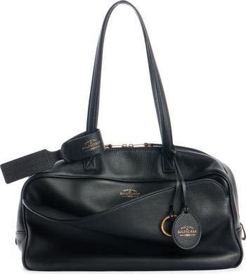 A slouchy silhouette inspired by vintage bowling bags defines this calfskin-leather satchel topped with handles short enough to carry in hand but long enough for shoulder carry.