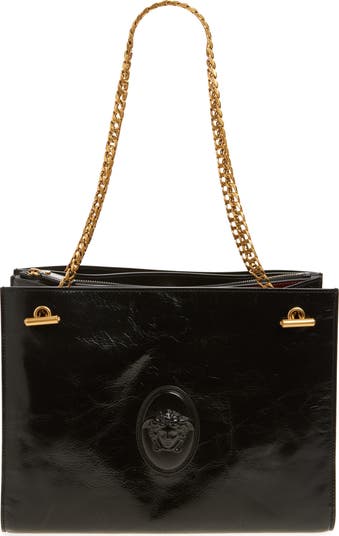 This versatile shoulder bag with golden chain straps is crafted from supple vegetable-tanned leather with a natural patina and hand-painted edges. The classic silhouette has multiple compartments and a central Medusa Cameo leather patch.