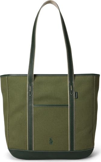 Heavy-duty canvas and rich leather accents emphasize the coastal-resort charm of this structured tote detailed with a house-signature embroidered polo rider.