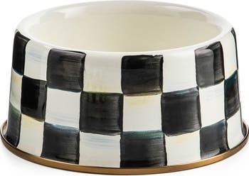 A heavy-gauge steel underbody is strong enough to withstand the mealtime antics of even the hungriest furry friends. Hand-painted check brings a brand-signature flourish.