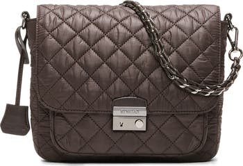 Gleaming logo hardware and diamond quilting distinguish a spacious and organized nylon crossbody bag fitted with a multitude of straps for easy on-the-go styling.