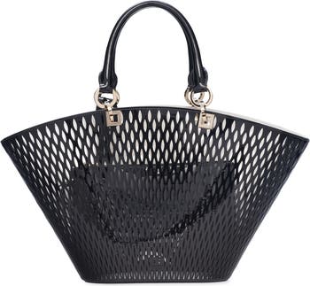 This fan-shaped tote is crafted in Italy from cutout patent leather with a bespoke pattern of vertical laser cuts creating a three-dimensional see-through effect against a contrasting interior. A glossy detachable zip pouch keeps smaller items secure.