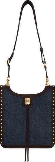 A denim exterior and supple suede trims distinguish a slender crossbody bag that's traced with studs down the sides for signature Rebecca Minkoff style.