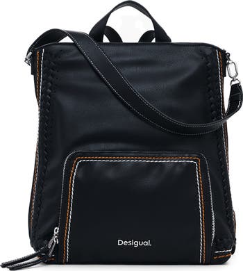 Decorative stitching charms this modern faux-leather backpack styled with a roomy interior and multiple pockets to keep your essentials secure.