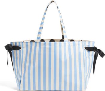 Adjustable side gussets and a reversible design add versatility and convenience to a durable nylon tote featuring a spacious interior and multiple pockets for easy organization.