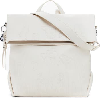Tonal floral embroidery adds whimsical dimension to a faux-leather backpack featuring a roomy interior and multiple straps for convenient on-the-go styling.
