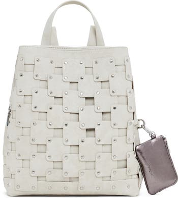 Studded square patches highlight the streamlined faux-leather exterior of a roomy backpack featuring ample compartments to organize your necessities. Includes a detachable metallic faux-leather coin purse keychain.