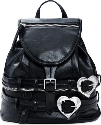 Heart-shaped buckles and zippered trims highlight the '90s-inspired profile of a faux-leather backpack featuring multiple pockets and straps for on-the-go convenience.