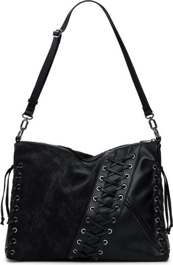 Complement your modern style with this fashion-forward crossbody bag fashioned with a lace-up design, grommet detail and a removable crossbody strap.