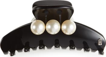 Adorned with faux pearls and featuring a classic houndstooth pattern, this glossy hair clip is a chic way to sweep up those flyaways.
