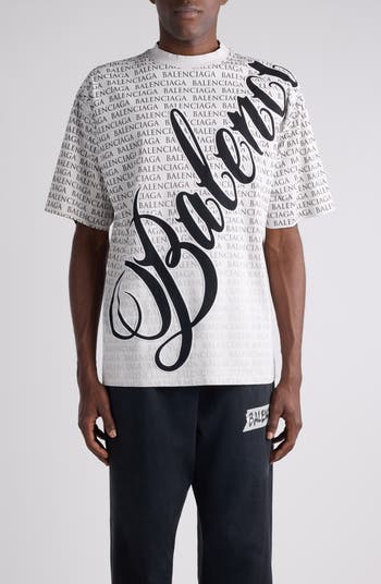 Balenciaga rewrites the rules of branding with this relaxed cotton T-shirt featuring graphic logos in a faded repeat overlaid with the maison's cursive Big B logo in tactile embroidery.