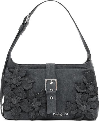 Complement your casual-chic style with this denim shoulder bag fashioned with flower appliqués and an adjustable shoulder strap.