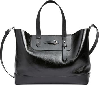 This polished calfskin-leather east/west tote features post-stud adjustable top carry handles in addition to the removable, adjustable crossbody strap for versatile carry options. The maison's discreet yet distinct white-stitched moniker adds an in-the-know touch at the top.