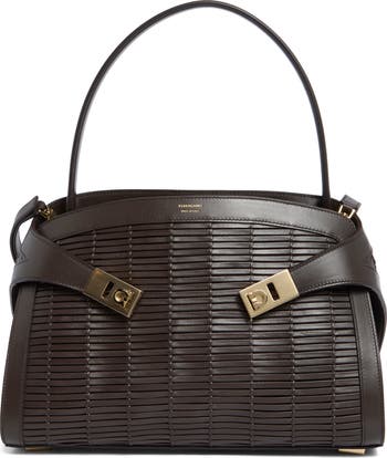 Extended tabs secured with Gancio flip-locks snugly embrace this retro satchel crafted in an enveloping, structured silhouette from a dense weave of leather straps.