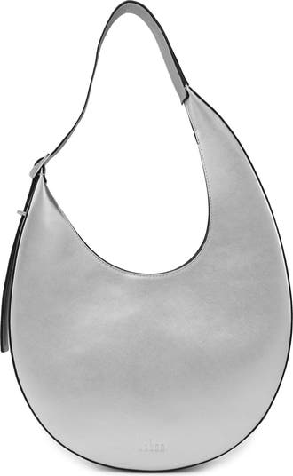 The line's rounded silhouette is taken to its sleekest, most statement-making extent in this crescent-shaped bag that is wide yet slim and shaped from lustrous metallic leather.
