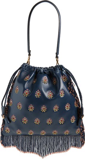 This boho-chic leather shoulder bag—which made an appearance on the label's spring '26 runway—is inspired by vintage art-deco pouches with crystal-embellished embroidery on the front and beaded fringe cascading from the sides and base.