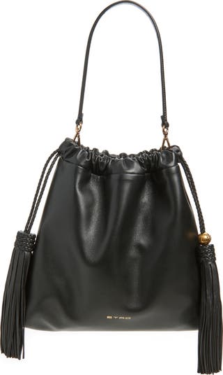 This leather shoulder bag is inspired by vintage art-deco pouches with a tassel-tipped drawstring closure that playfully sways with you as you move through your day.