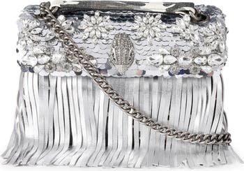 Glamorous sequins and swingy fringe enrich the jewel-accented exterior of a mixed-media crossbody bag suspended from a convertible chain strap for versatile wear.