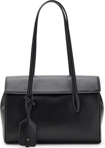 This boxy leather shoulder bag has a well-organized interior with dual compartments and features a leather bag charm tipped with a golden metal ring for a stylish touch.