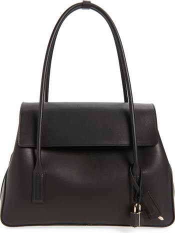 Double-T protective feet and padlock hardware put house-signature touches on this rich leather shoulder bag that softly flares at the base.