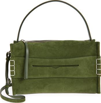 A topstitched 'keeper strap' modeled after classic penny loafers puts a prepster twist on this everyday-sized bag crafted from velvety Italian suede.
