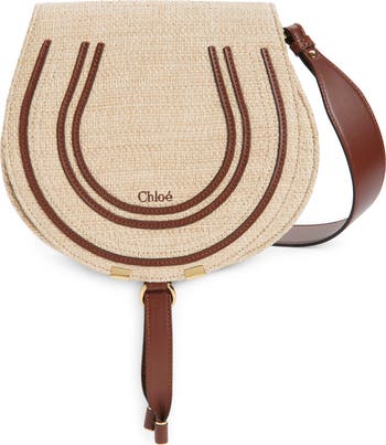 Swingy tassels and iconic saddle stitching ornament the horseshoe-shaped flap of a faux-raffia bag trimmed in leather for smooth contrast.