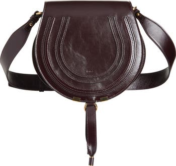 Curvaceous detailing and golden hardware ornament the saddle-shaped flap of a crossbody bag designed in a compact yet roomy silhouette from burnished calfskin leather.