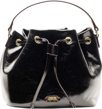 A gleaming logo shines against the crinkled leather of a slouchy bucket bag designed with a drawstring-cinched topline and several carrying options.