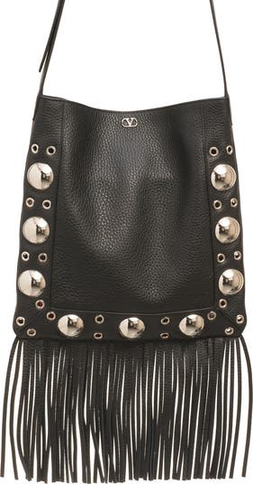 A signature VLOGO and boldly oversized studs and grommets amp up the hardware shine of this richly pebbled Italian-calfskin crossbody cascading with bohemian fringe.