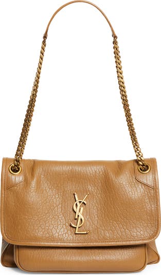 A gilded YSL monogram authenticates a timeless shoulder bag shaped from tumbled calfskin leather and packed with pockets, inside and out. A chain-and-leather pull-through strap can be worn doubled for shoulder carry or extended for crossbody style.