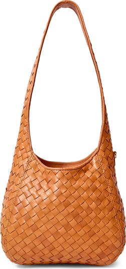 Intricately woven leather adds eye-catching texture and contrast to a beautiful shoulder bag featuring a spacious interior and elongated strap for comfortable wear.
