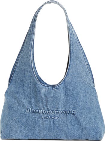 Embossed logo lettering subtly brands this faded-denim hobo bag that's crafted in a slouchy, triangular silhouette with integrated shoulder straps.