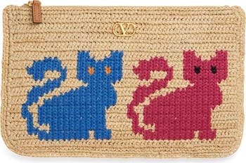 High-polished VLOGO hardware brings house-signature shine to this superslim pouch artisanally crafted from crocheted raffia with colorful cat graphics worked into the design.