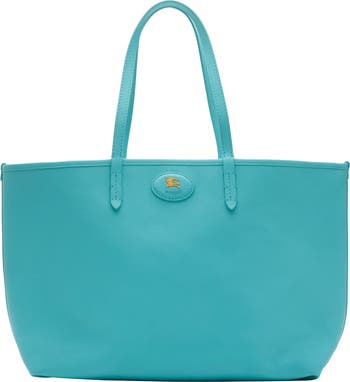 A spacious tote made in Italy from grainy calf leather, reversing to a Burberry Check cotton linen blend in seasonal atom blue. The Bloomsbury collection is finished with a leather and metal Knight stamp, an archival motif first seen on Burberry bags in the 1980s. Comes with a detachable press-stud pouch to secure smaller items.||Top handles|Detachable pouch|Hand-painted edges|Brushed metal hardware|Leather patch with Equestrian Knight Design at front|Comes with a dust bag