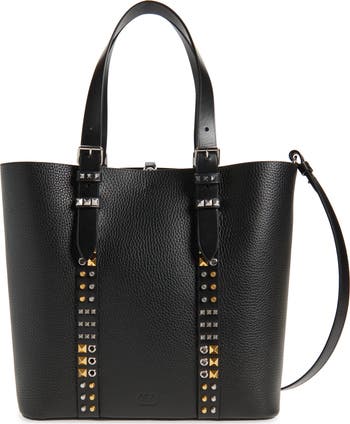 Signature Rockstud detailing brings metallic moto-style panache to this roomy tote made from grainy calfskin leather and designed with both top carry handles and a crossbody strap—all adjustable to your most comfortable carry method.